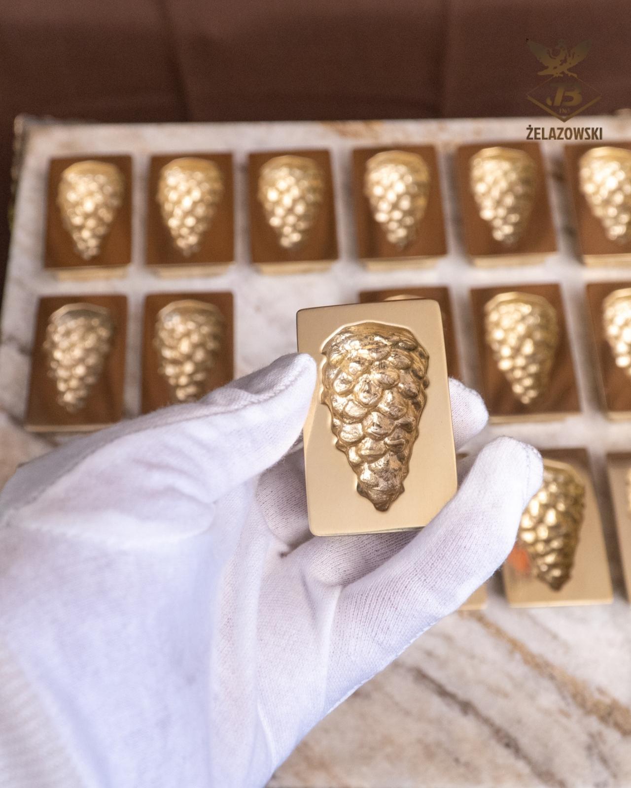 Mosiężne uchwyty meblowe wykonane na indywidualne zamówienie, z motywem szyszki.