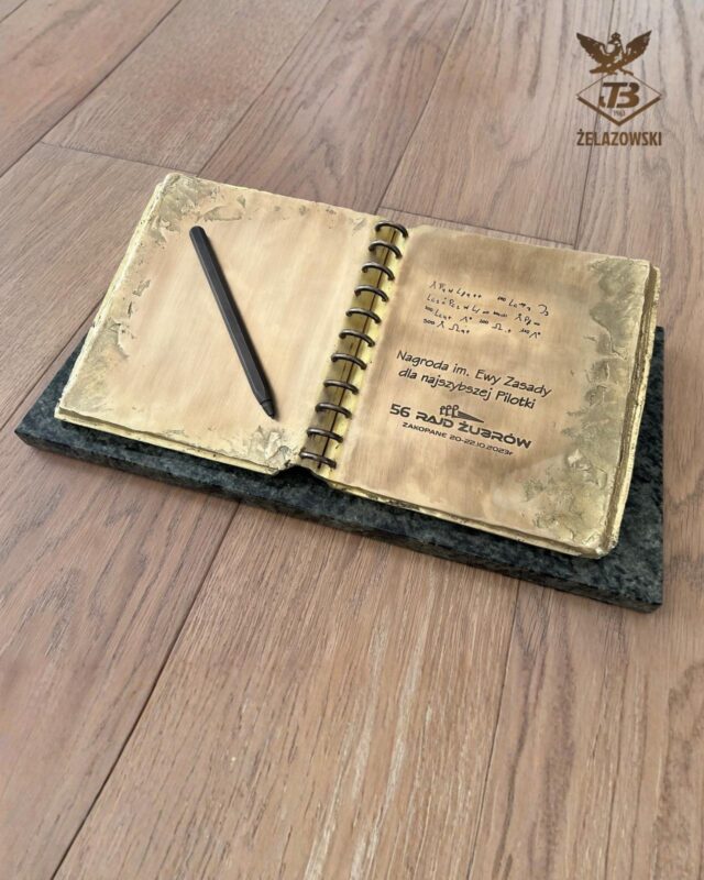 Statuetka w formie otwartej księgi wykonana z mosiądzu, przygotowana jako nagroda rajdu Żubrów.